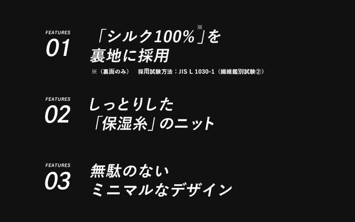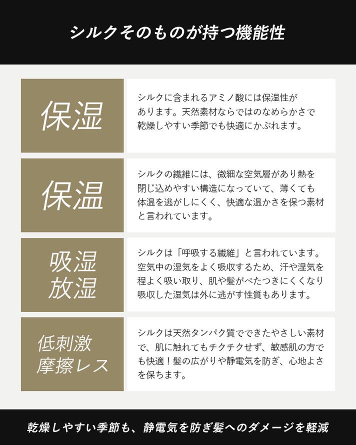 シルクに含まれるアミノ酸には保湿性があります。天然素材ならではのなめらかさで、乾燥しやすい季節でも快適にかぶれます。