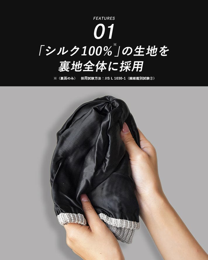 - 贅沢仕立て!髪が触れる裏地全面にシルク100%※採用!(静電気を防ぎ、髪へのダメージを軽減)