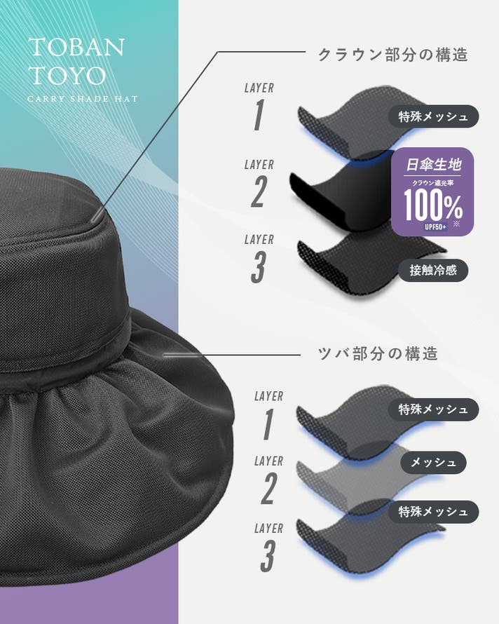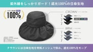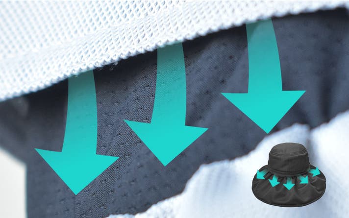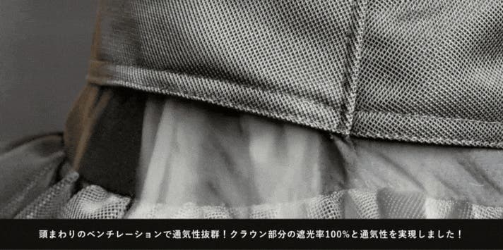 クラウンには「遮光100%日傘生地」を特殊メッシュと接触冷感で挟み、ツバには「メッシュ生地」を特殊メッシュでサンド。その結果、日差しをしっかり遮りながら、風を受け流すという相反する機能をひとつの帽子で両立しました。
