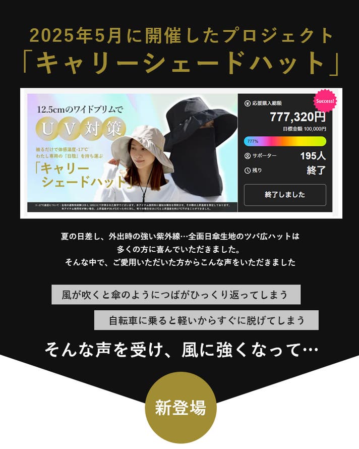 - お客様の声で、風に強くアップグレード!遮光と通気の相反する機能をひとつの帽子で両立しました!