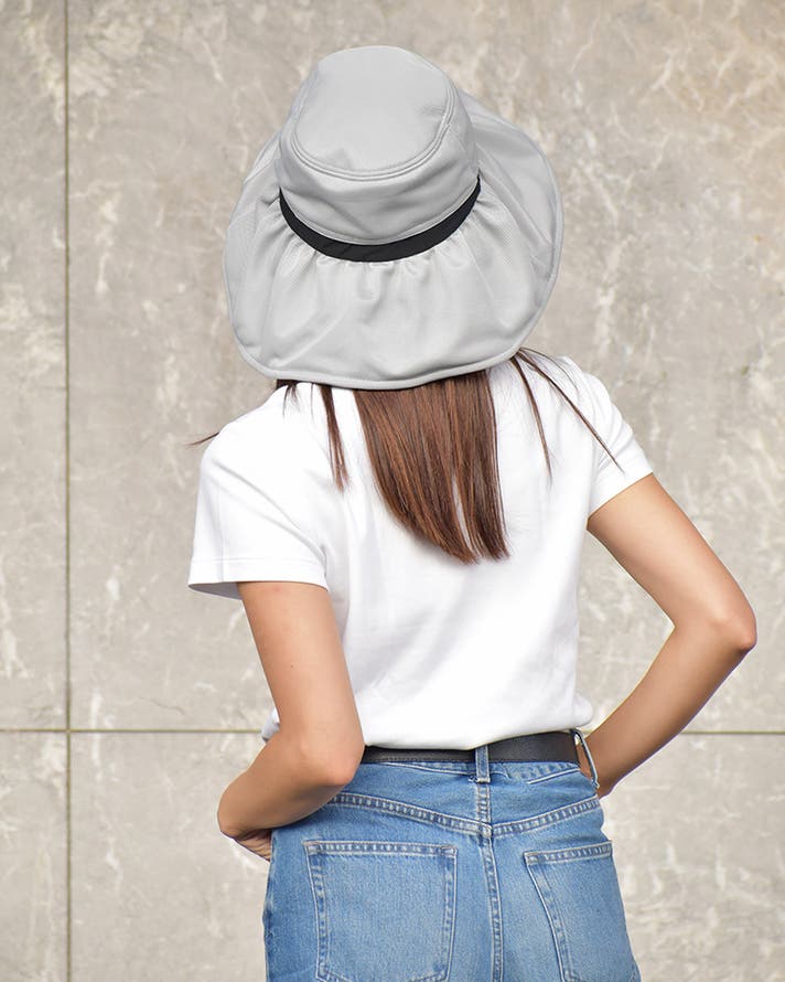 「日差しは防げるけど、もう少し風が通るといい」そんな声から改良を重ねました。クラウン部分は、遮光100%の日傘生地をメッシュで挟んだ三層構造。そこに、頭まわり一周ぐるりと風が抜けるベンチレーションを追加しました。強い日差しをしっかりガードしながらも、帽子の中にこもる熱を逃がしてくれる。真夏でもムレにくく、軽やかにかぶれる快適な設計です。