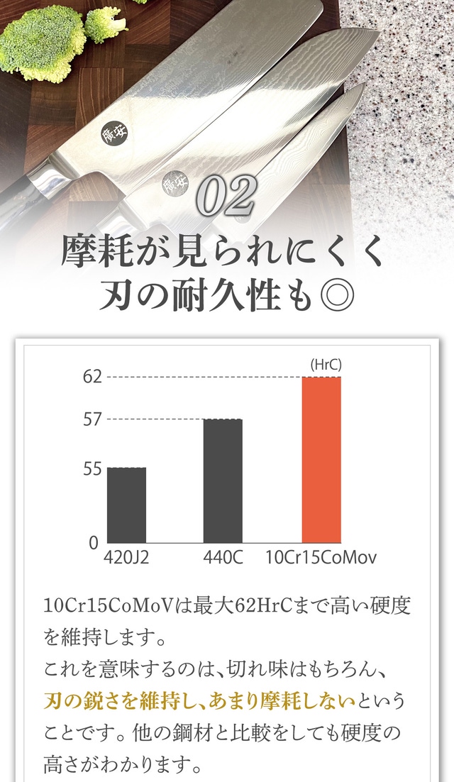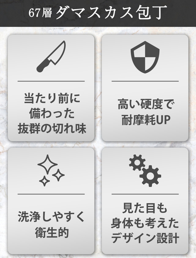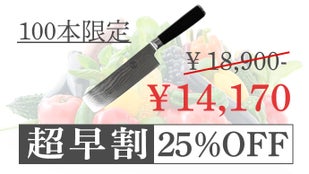 - 切れ味は基本装備の67層ダマスカス包丁・ハンマーで叩いても折れない強靭な耐久性