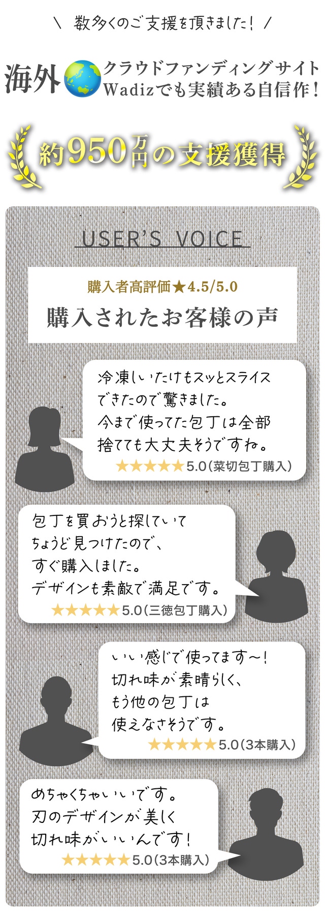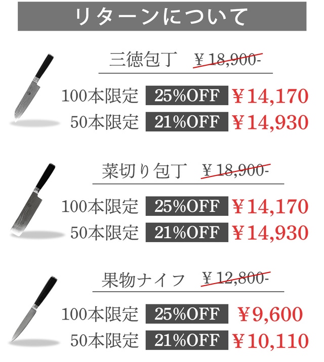 ※リターン品の配送が完了するまで、HTMEは 67層ダマスカス包丁 の日本における独占販売権を有する正規代理店です。詳細に関しては、ページ下部のリスク&チャレンジをご確認ください。