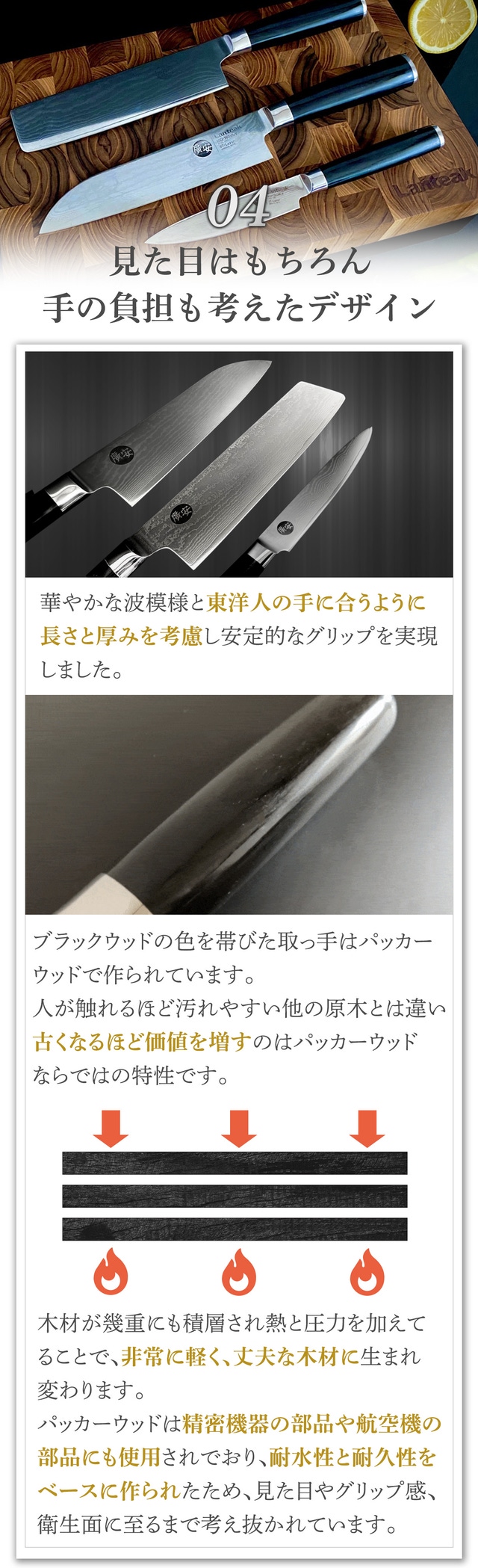 - 握りやすいグリップは積層強化木(パッカーウッド)で作られ、使い込むほど価値がでる優れもの!