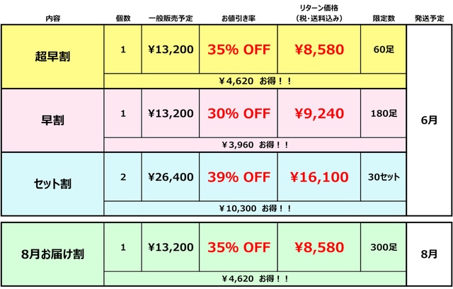 【 早割 30%オフ 】9240円コース(税込・送料込)180足限定