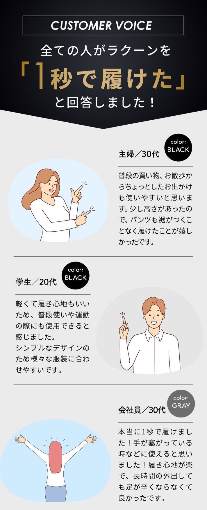 A : 本当に1秒で履けます。商品展示会にて10名以上のお客様にラクーンをご体験いただき実証済みです。