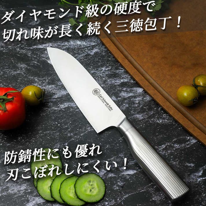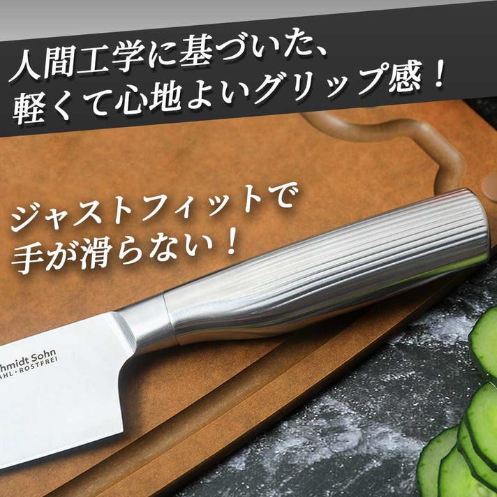 さらに、軽量で握りやすい人間工学に基づいた設計で、肉・野菜・魚・パンまで対応できる三徳形状。