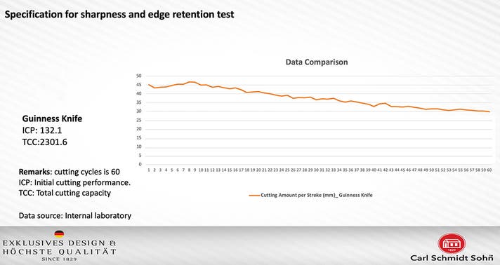 高い硬度を誇るこの「LaserEdge三徳包丁」は、切れ味の持続性において検査機関でも優れた結果が得られています。