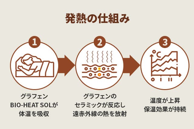 「Bio Heat Sol」というグラフェン素材には、体温や暖房器具、照明の熱を吸収する特性を持っています。このグラフェンにはセラミックが含まれており、熱に反応して遠赤外線の熱を放射します。これにより、布団内の温度が上昇し、グラフェンとPolafilを重ね合わせることで持続的な保温効果を実現しています。