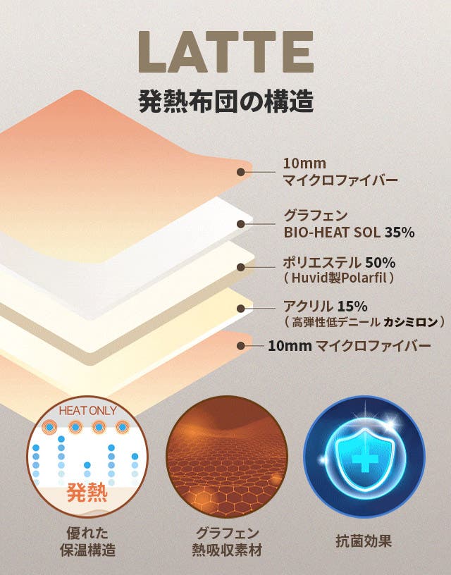 LATTE発熱ふとんは、特許取得の「Bio Heat Sol」というグラフェン素材を利用して開発された掛けふとんです。この素材は、体温や照明などからの熱を吸収し、遠赤外線を放射する機能性をもっています。真冬であっても、すぐ布団の中が温まり、快適な睡眠をサポートします。