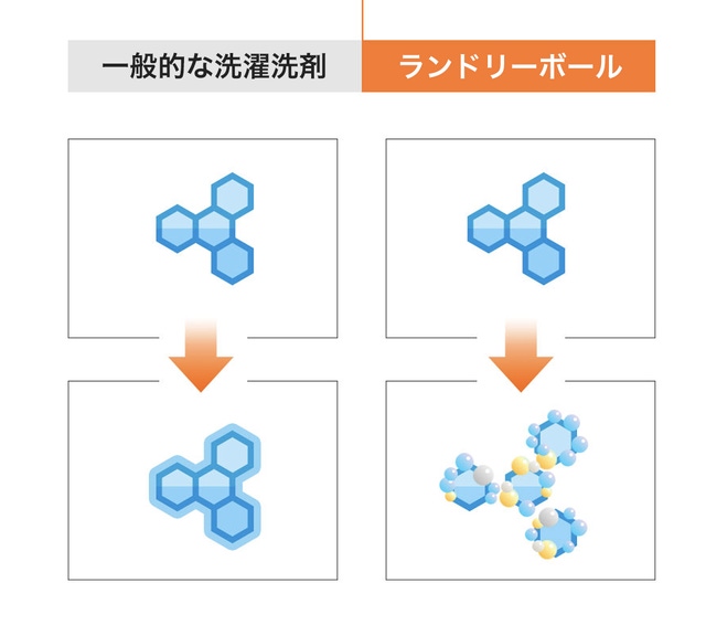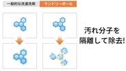 マイクロランドリーボールの界面活性分子が、汚れ分子を囲み、隔離してきれいに除去します。