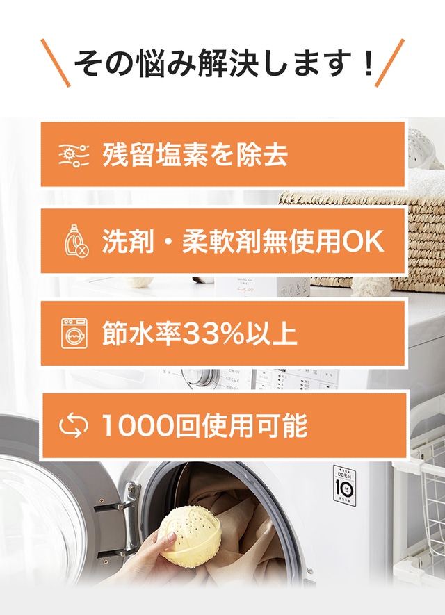 マイクロランドリーボールを入れるだけで、残留塩素がきれいに除去されます。