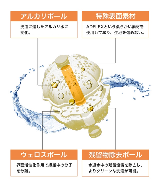- 洗剤・柔軟剤使用量を50%~70%削減!洗濯に最適な水質へ変化させるマイクロボール!