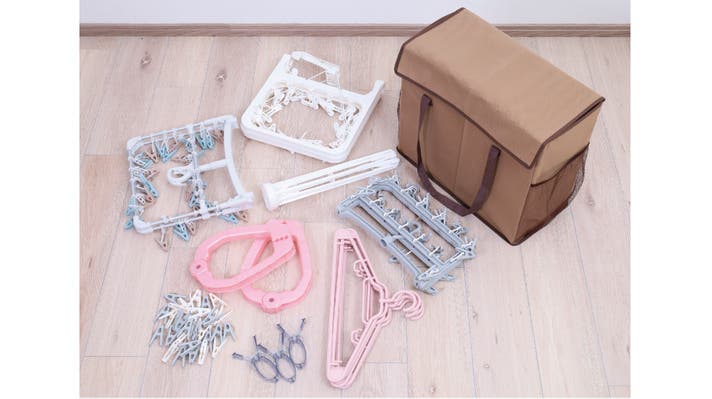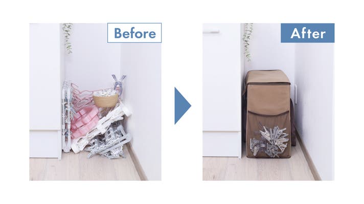 置き場所に困るハンガー、洗濯ばさみ、洗濯ネットなどの洗濯用品。
