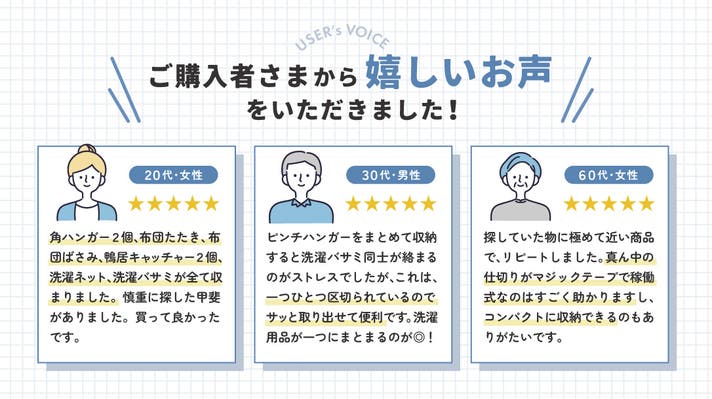 さらに多くの方に満足していただけるよう、嬉しいレビューだけではなく、ご購入者さまの「リアルな声」を参考にし、リニューアルしました。