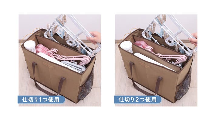 かさばるピンチハンガーや、小さくてバラバラ散らばりやすい洗濯ばさみなど、種類ごとに分けてたっぷり収納できます。