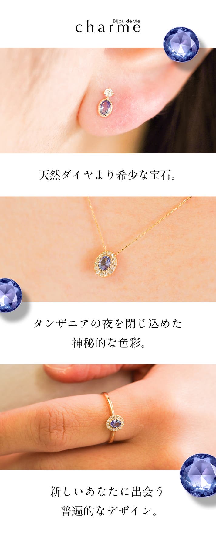 そのためタンザナイトは、見る角度によって青や紫の色合いが変わるため、いつ見ても新しい表情を楽しめる幻想的な宝石なんです!
