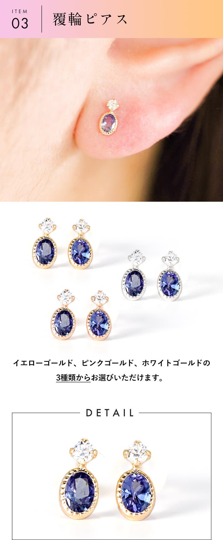 鑑定歴34年の熟練バイヤーが発見し、厳選した宝石を使った、10金のジュエリーです。金の資産価値だけではなく、末永く愛用できるよう、デザインのバランスを考えた程よい大きさの宝石を使い、洗礼されたデザインにしております。
