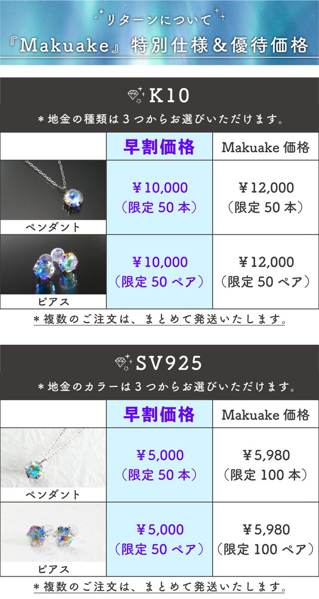 ※天然宝石および使用素材上、色柄・内包物・形サイズに個体差がありますので予めご了承ください。 ※使用感等に関する返品・返金はお受けいたしかねます。 ※開発中の製品につきましては、デザイン・仕様が一部変更になる可能性もございます。 ※応援購入の数が想定を上回った場合、製造工程上の都合等により出荷時期が遅れる場合がございます。 配送に遅れが生じる可能性が判明した場合、直ちにご報告させていただきます。 ※本プロジェクトを通して想定を上回る皆様から応援購入頂き、現在進めている環境から量産体制を更に整えることができた場合、正規販売価格が販売予定価格より下がる可能性もございます。 ※本プロジェクトの実施において十分確認は行なっておりますが、類似品が発覚する可能性がある点、ご了承願います。 ※本文中に記載させていただいたスケジュールは、あくまでプロジェクト公開時点の予定です。 応援購入の性質上、配送遅延のおそれがございます。 ※原則として、配送遅延に伴う応援購入のキャンセルはできませんが、 リターン配送予定月から3ヵ月を超えた場合には、希望者に限りキャンセルにて対応させていただきます。 応援購入サービスの性質上、以上の注意点につきましてあらかじめご理解とご了承いただいた上でご支援くださいますよう、よろしくお願い申し上げます。