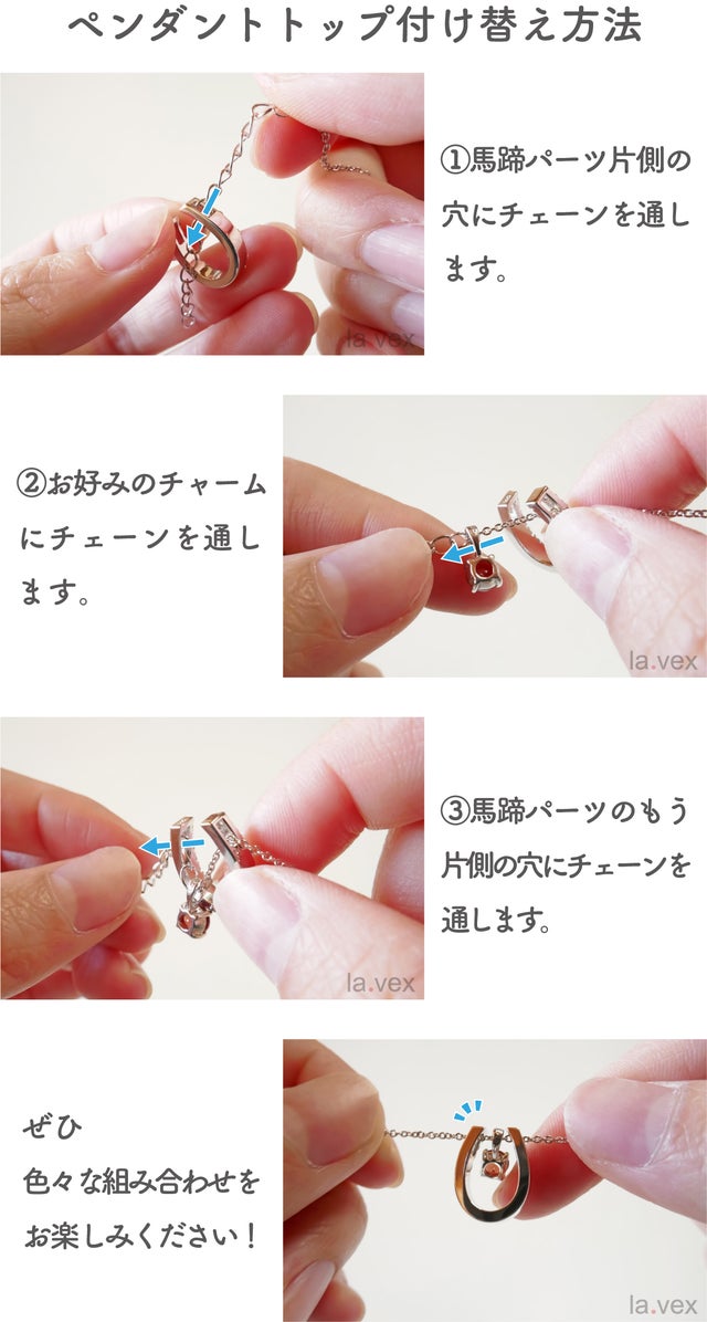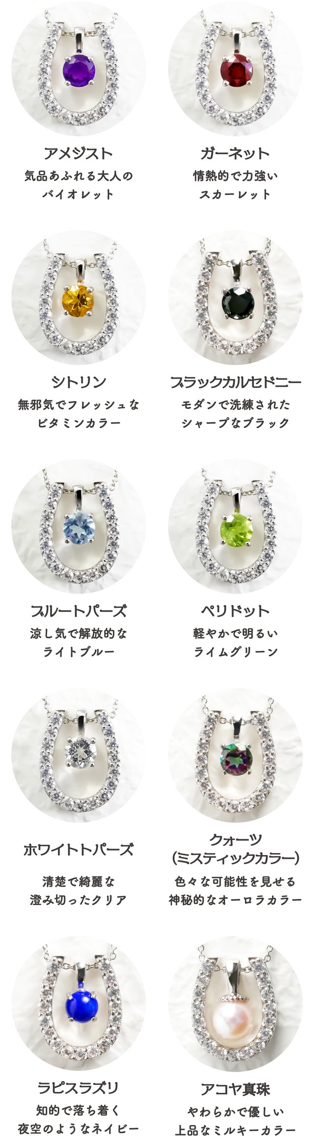 幸運の印とされている馬蹄と10石の天然石を簡単に替えられるので、様々なシーンでお楽しみいただけます。