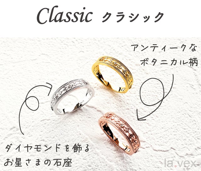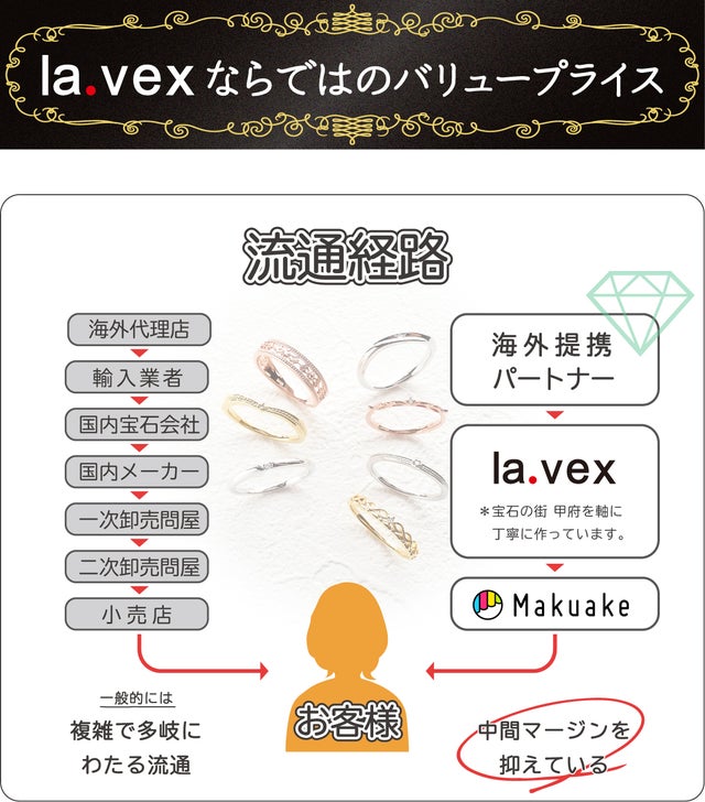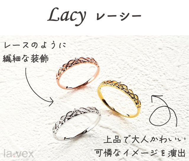 la.vexには「あっと言わせる・驚かせる・感動させる」と言う意味合いが込められています。それはデザインであり品質でありプライスであり、ジュエリーを通して皆様に笑顔と喜びをお届けしたいと思っています!