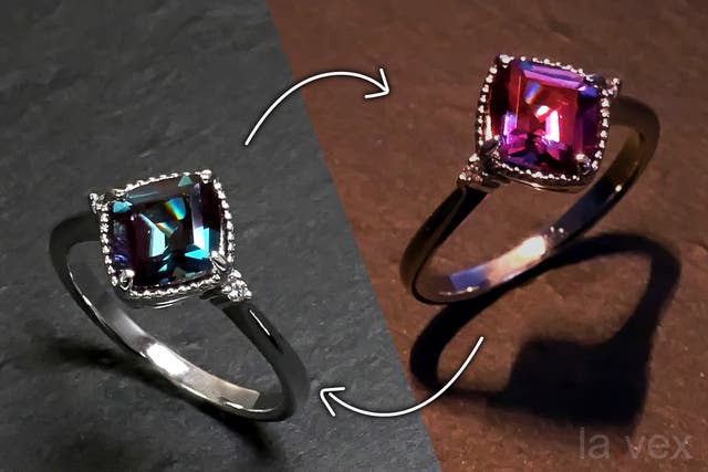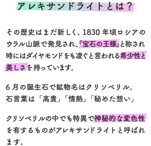 産地によって変色効果は様々ですが、ロシア・ウラル山脈産は昼にエメラルド・夜はルビーと称されるほど神秘的でドラマティックなカラーチェンジを見せることから、世界的にも特に高い評価を得ています。