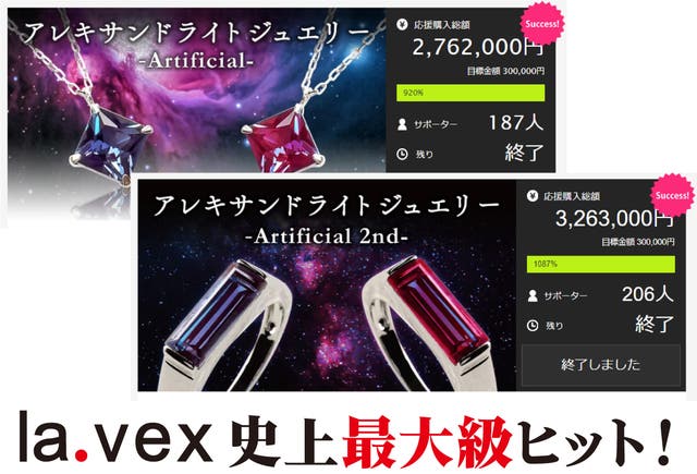 山梨県のジュエリーメーカー株式会社LAVEXです。 百貨店・TV・カタログショッピングで全国展開しています。過去におこなった『Artificialアレキサンドライト』プロジェクトは大変ご好評をいただき、無事成功しました。みなさま誠にありがとうございました。