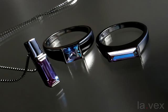 シックで重厚感があるブラックコーティングを用いたArtificialアレキサンドライトのジュエリーはこちら!