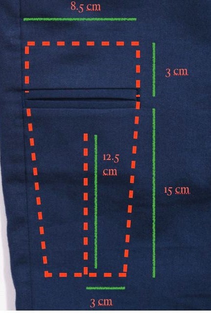 ペンポケットはこのように二股になっています。(サイズには多少の誤差が生じることがあります。)