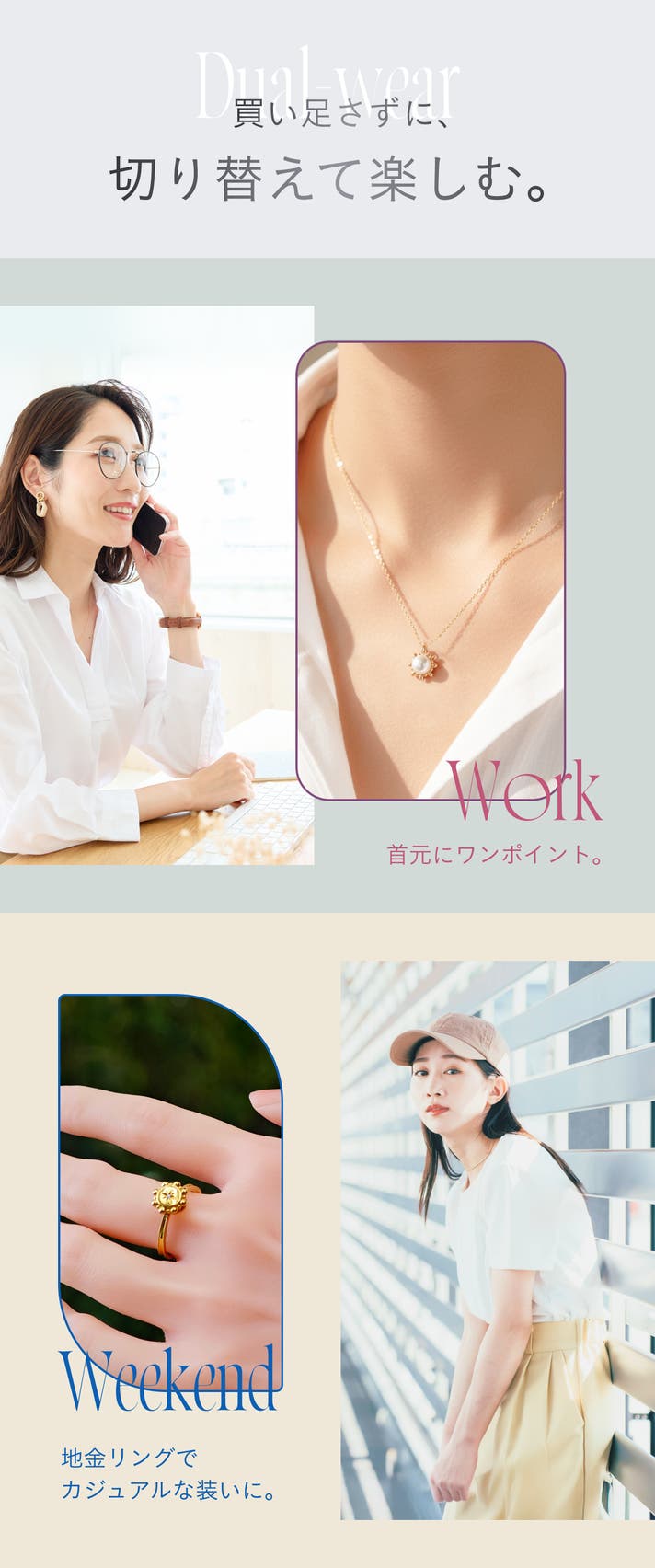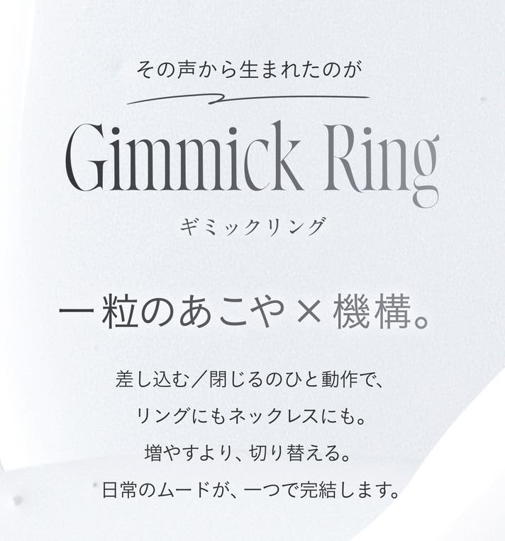 様々な指に着けることができ、ネックレスにもなるギミックリングはそのようなお声に応えるべく、誕生致しました。