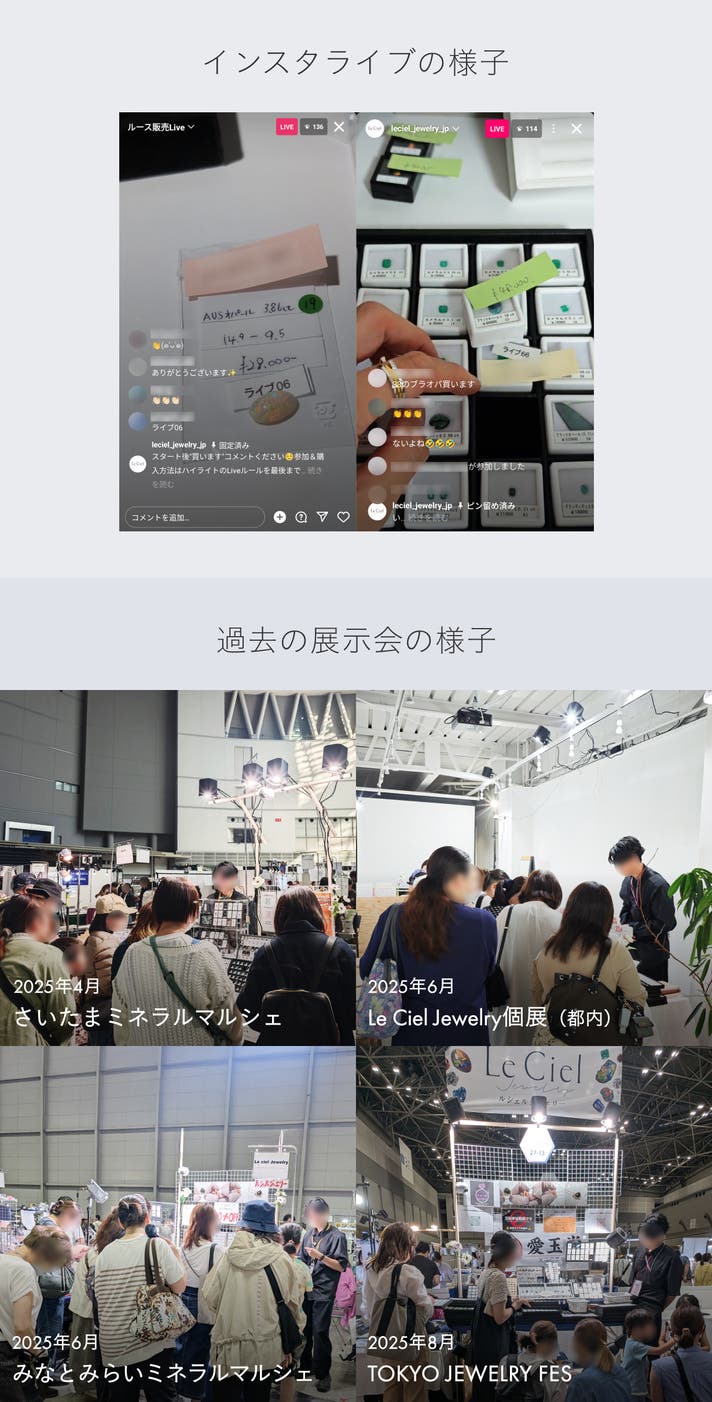 三代続く宝石卸の知見を礎に、目利きのルース選定と日常で使い切れる設計にこだわるジュエリーブランドです。オンラインのInstagramライブ(月2~3回)販売に加え、首都圏を中心に展示会/POP UPも開催。実物を見て選べる機会を設けています。