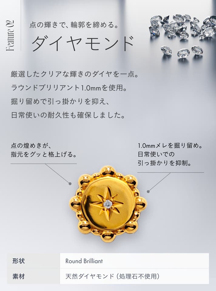 ダイヤは非常に硬い反面、一定方向からの強い衝撃には弱く、欠けてしまうことがあります。特に台所作業やスポーツの際には外していただくのがおすすめです。