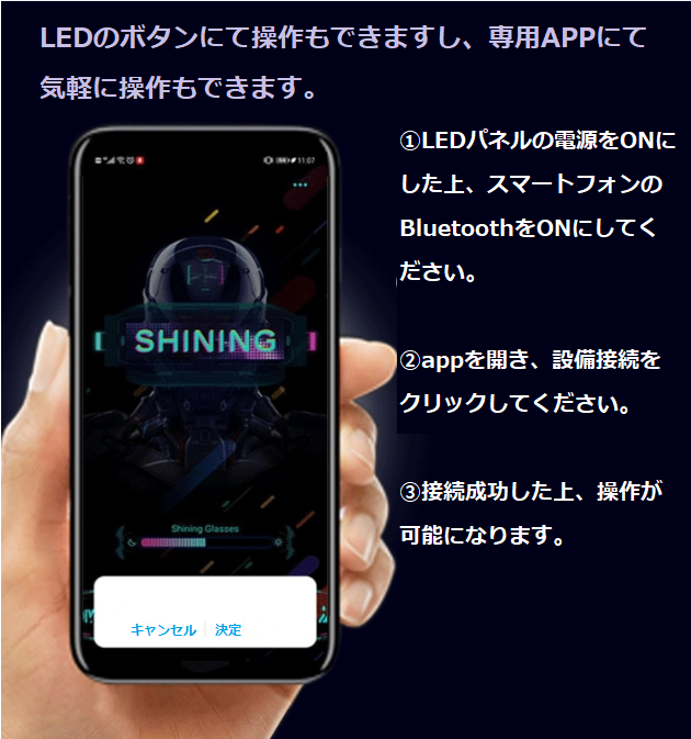 専用アプリ【Shining Glasses】にはたくさんのツールがあり、ライブラリから静止画・GIFの表示ができますし、ご自作の文字・GIFを表示させることも可能です。DIYにてリアルタイムで落書きを表示させることも可能な面白いLEDグッズです。