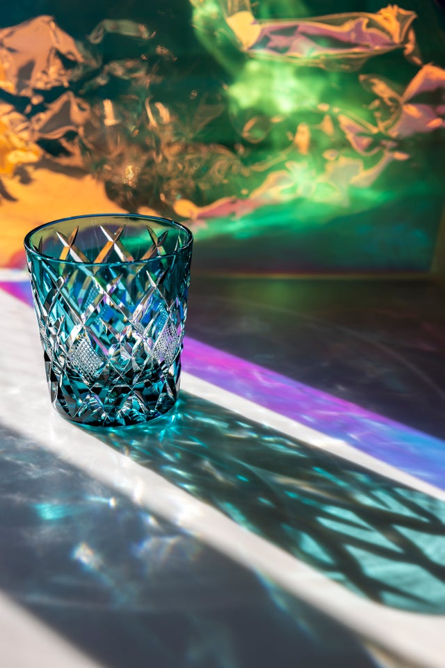 江戸切子の細部に目をやると、緻密で繊細な職人の手作業に気づく。放射状に広がる美しいカットはまるで何かの生命体のように生き生きとしていて、光が当たる角度によって変化する煌めきに惹きつけられる。