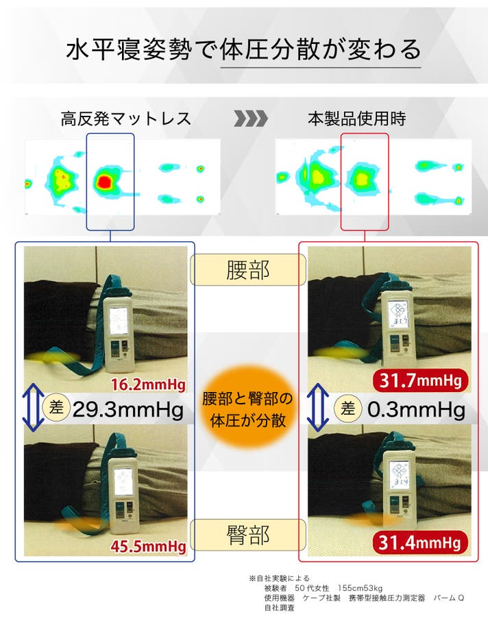 最も体圧がかかる腰部〜臀部の体圧がしっかりと分散します。