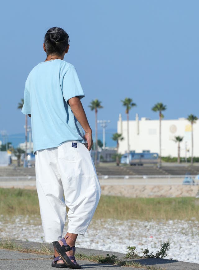 8ozのライトオンスデニムを『 バイオストーン ブリーチ オーバーダイ 』という技法によってUSED感を演出しました。穿いた瞬間から馴染む仕上がりです。