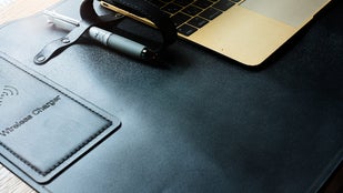 - イタリアンレザー製の高級デスクマット。ワイヤレス充電機能を搭載でケーブルもサヨナラ!