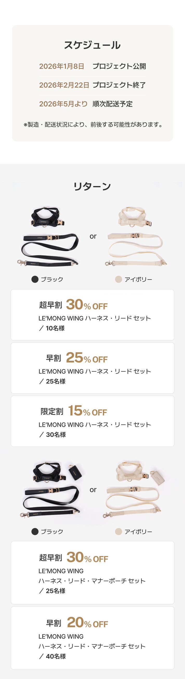 ※撮影環境やご利用のモニター設定により、実際の商品と色味が異なる場合がございます。 ※開発中の製品につきましては、デザイン・仕様が一部変更になる可能性がございます。 ※応援購入の数が想定を上回った場合、製造工程上の都合等により出荷時期が遅れる場合がございます。遅延の可能性が判明した際には速やかにご報告いたします。 ※本文中に記載しているスケジュールは、あくまでプロジェクト公開時点での予定です。応援購入の性質上、配送遅延が生じる場合がございます。 ※原則として配送遅延に伴うキャンセルはできませんが、リターン配送予定月から3ヶ月を超えた場合には、希望者に限りキャンセルにて対応いたします。 ※お客様都合(サイズ違い・誤注文・長期不在など)によるキャンセルや返金は承っておりません。製品の仕様・サイズにつきましては、プロジェクトページを十分にご確認の上ご購入ください。 ※長期不在·住所不明などによる回送·再送の費用は、サポーター様負担となります。 ※本プロジェクトを通して想定を上回る応援購入をいただき、量産体制がさらに整った際には、正規販売価格が販売予定価格より下がる可能性がございます。 ※本製品は当社が独自に企画・設計したオリジナル商品ですが、市場には類似品・模倣品が存在する可能性がございますのでご了承ください。 ※プロジェクトページに記載している内容に変更がある場合には、できるだけ早く活動レポートなどで共有を行っていく予定でございます。 ※応援購入サービスの性質上、以上の内容をご理解・ご了承いただいた上でご購入くださいますよう、よろしくお願い申し上げます。 【商品等の不具合による返品・交換】 ◾️対応条件:商品の初期不良、またはお届けした商品がご注文内容と異なる場合、到着後14日以内にプロジェクトページの「実行者にメッセージ」よりご連絡ください。状況を確認の上、返金対応、または良品との交換対応をさせていただきます。 ◾️返金額:リターン金額(税込)の全額 ◾️返品送料/再送料:実行者負担 【返品・交換をお受けできない商品】 ・サポーター様の責任により破損、汚損が生じた商品 ・商品のタグ、付属品、パッケージ(箱、袋など)を紛失、破棄された商品 ・事前にご連絡をいただいていない商品 ・商品到着後、15日以上経過した商品 【交換をお受けできないケース】 ・限定品や同一商品の在庫がない場合など、代替品をご用意できない商品