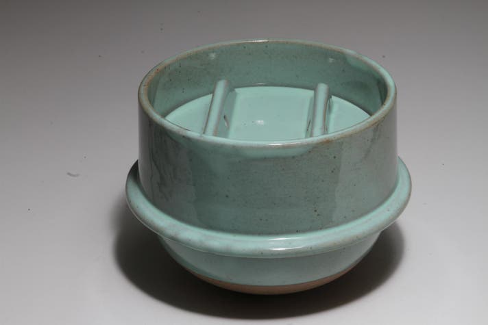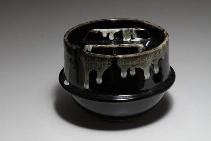 完成したレンジオーブン用唐津焼竈門ご飯土鍋1個。色柄はお選びいただけます。マクアケ割でご用意できる数量は全色柄込みで1000個となります。