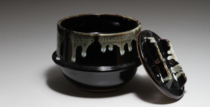 マクアケ割 6,980円:完成したレンジオーブン用唐津焼竈門ご飯土鍋1個。色柄はお選びいただけます。