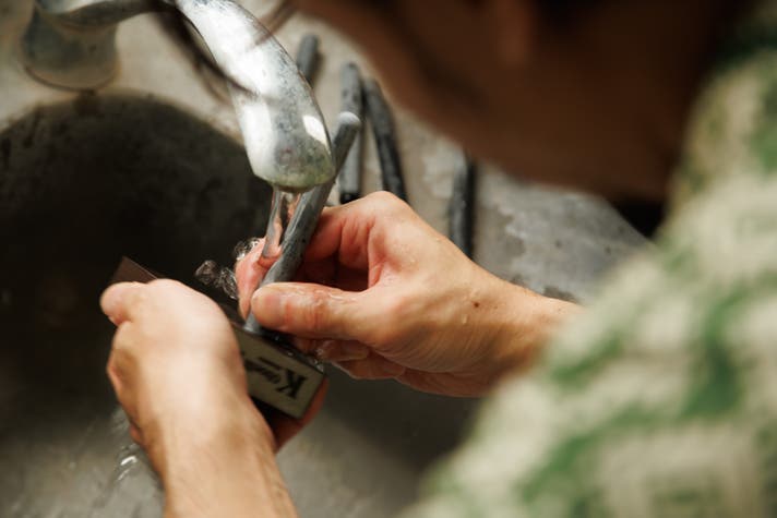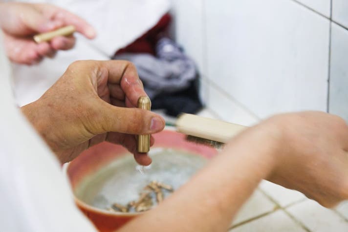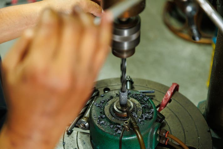 ある程度の柔らかさを保ちながら強度を確保できた素材に、補強のために胴軸に真鍮製のパーツを入れるため内側にスペースを確保します。この作業は熟練の職人さんに依頼。1つ1つの作業に、思わず息が止まります。
