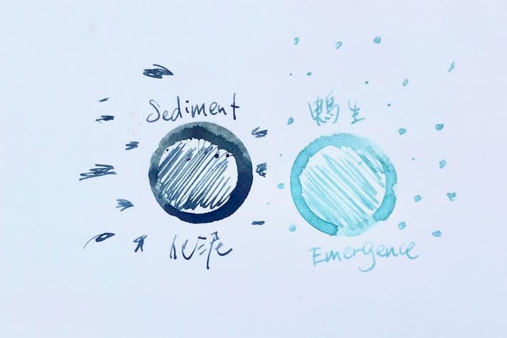 水は大山を流れ下り、数百万年もの岩壁を削り、打ち砕き、揉みほぐし、転がし、叩きつけます。やがて広大な湖にたどり着き、静かに沈み、降り積もり、幾重にも層を重ねていきます。それはやがて、大地に刻まれた時の物差しとなるのです。今回のプロジェクトの万年筆の素材となった水庫(ダムや貯水池)の底泥をイメージした色目です。