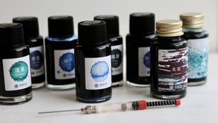 オリジナル万年筆のために生み出されたインク「鴨生(ヤーシェン)」または「化泥(ホアニー)」 と人気の定番インク、藍染風の「鉄紺」「納戸」「浅葱」「熨斗目花」「紺藍」「水色」のいずれか1本と インクを入れ替えるのに便利なインク吸入器具と一緒にお届けのセット。
