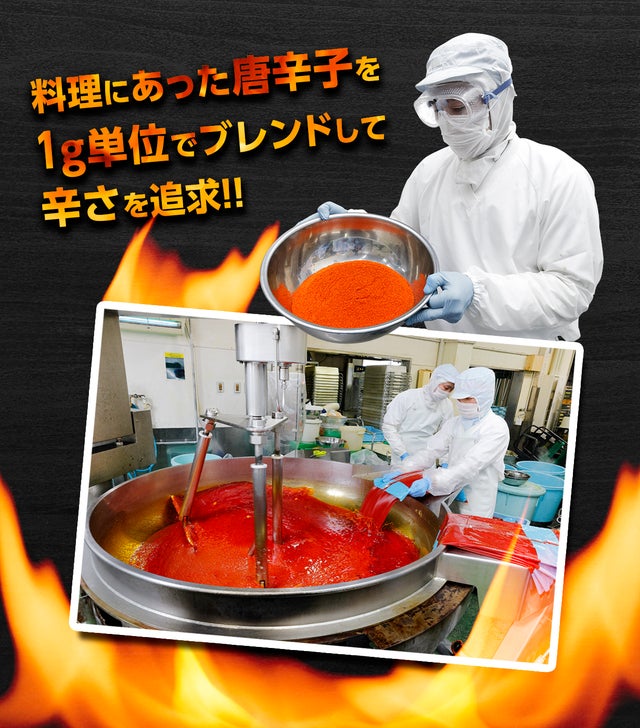 唐辛子の量もg単位で調節し、辛さと旨さを両立するために味の調節も!そして、美味しさ保障のために激辛好き社員ほぼ全員に食べてもらい辛さに悶えながら味の評価をしてもらい、改良を重ねました。
