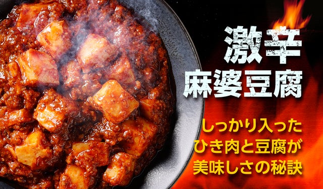 「激辛の王道」麻婆豆腐。厳選したブレンド唐辛子を使用し、スパイスの香りが漂う餡が旨味と辛さを一層引き立てます。そして、しっかりひき肉と豆腐が美味しさが秘訣。肉汁たっぷりの挽肉と存在感のあるゴロゴロ豆腐で具材感を楽しめ食べ応え抜群!餡と絡むことでしっかりとした深いコクと旨味を引き出しました。本格中華麻婆の味をご堪能ください。