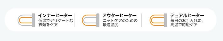 2つのヒーターを搭載し、それぞれを制御してお湯を沸かすことで、衣類に応じたスチーム量が段階的に調整可能です。