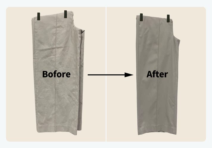 ハンガーにかけずに、付属しているクリップに挟んで折りたたむ構造にすることで、より座りジワなどの細かなシワを取り除き、ズボンのセンタープレスもくっきりとキープすることができます。