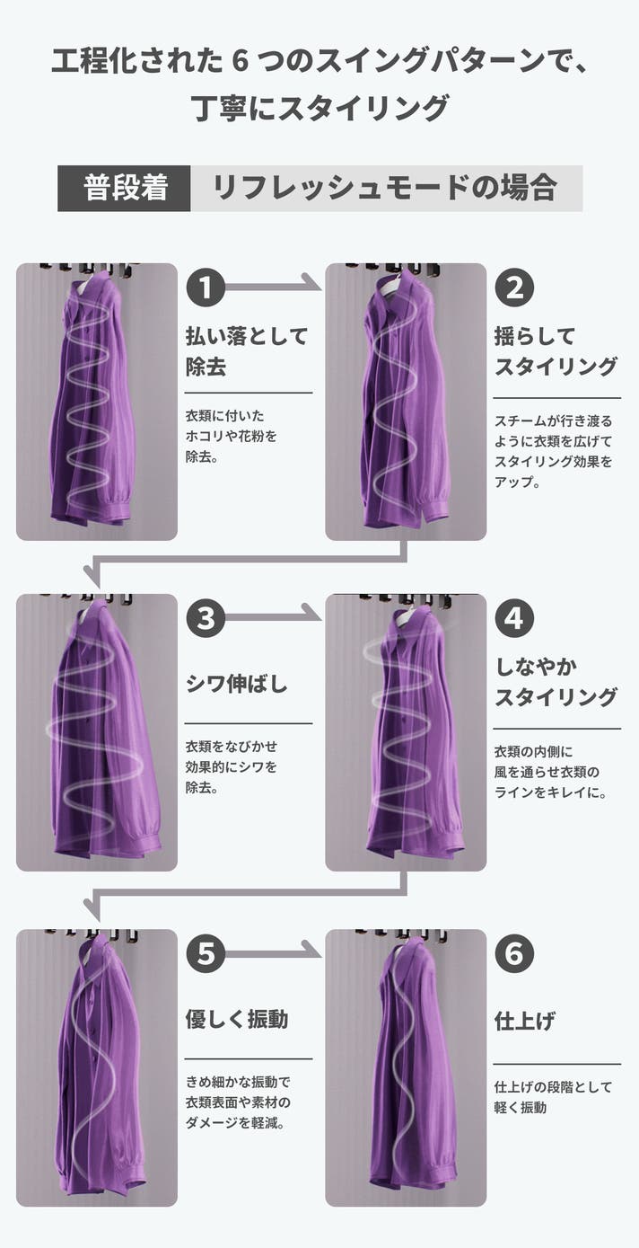 1分間に最大350回と、素早く効果的にスイングすることで、衣類に付いた花粉やほこりなどをパワフル&スピーディーに落とし、しっかりとシワを伸ばします。