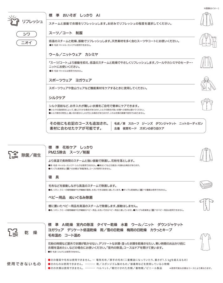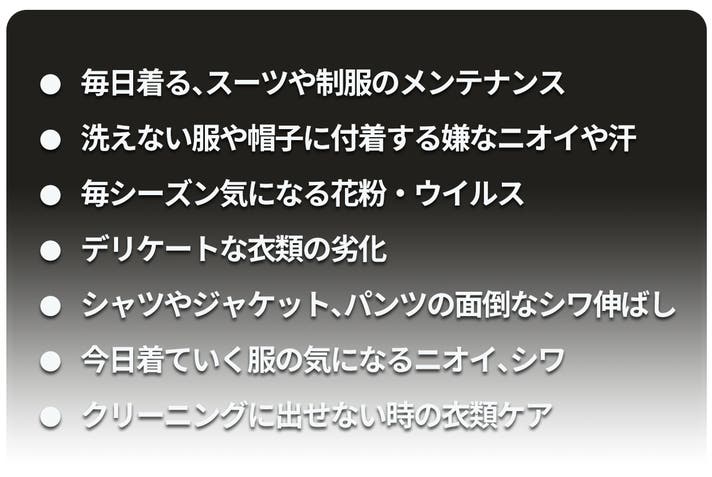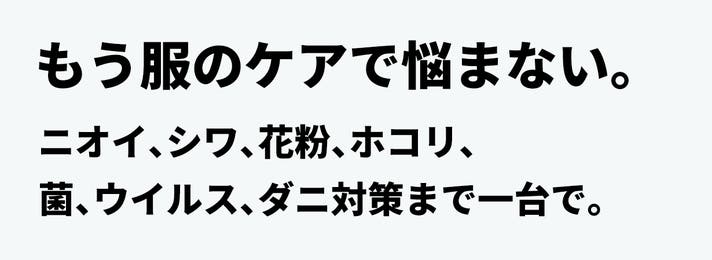 - もう、服のケアで悩まない。ニオイ、シワ、花粉、ホコリ、菌、ウイルス、ダニ対策まで一台で。