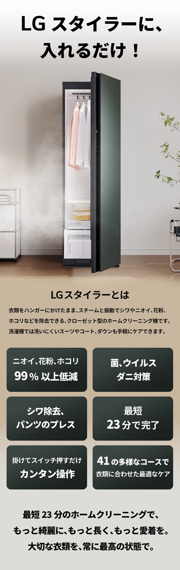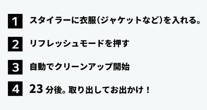 - 日常着からデリケートな衣類まで、最短23分で簡単ケア。大切な衣類を、常に最高の状態で。
